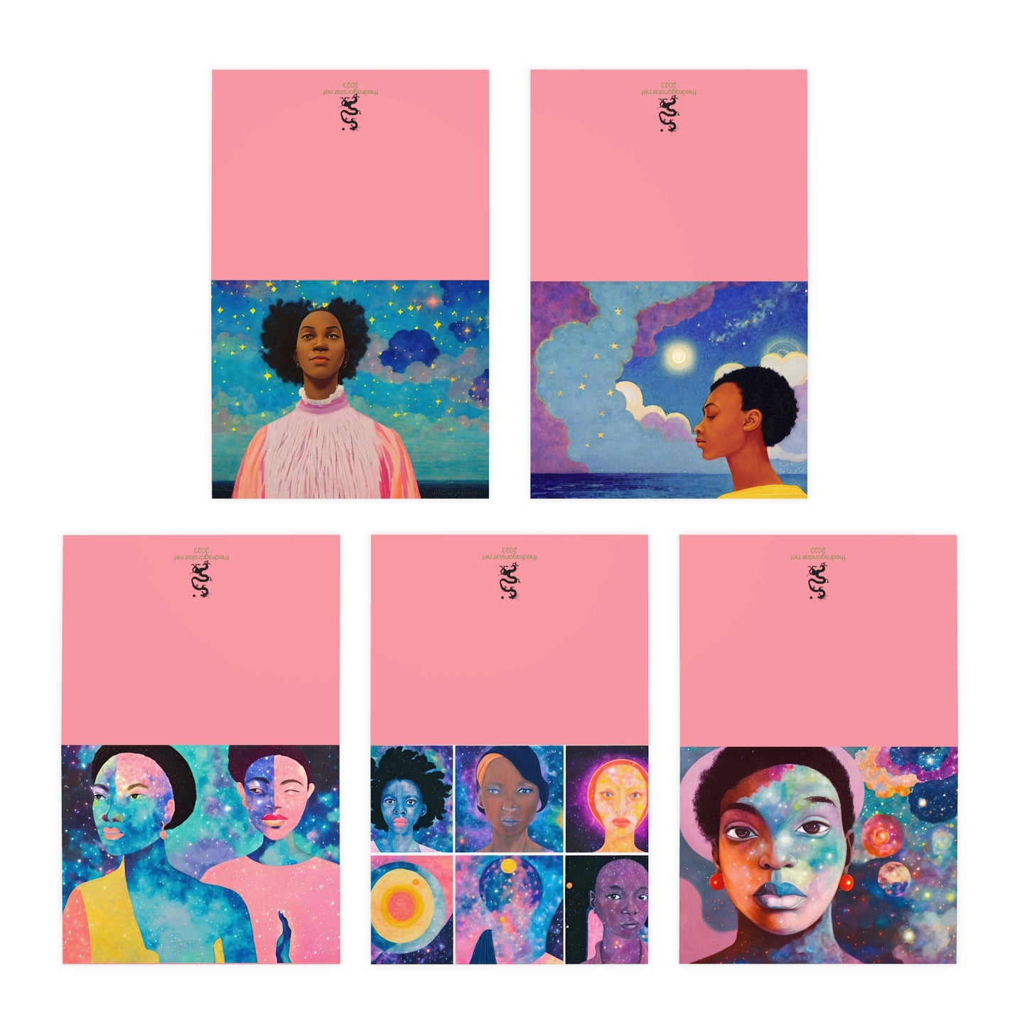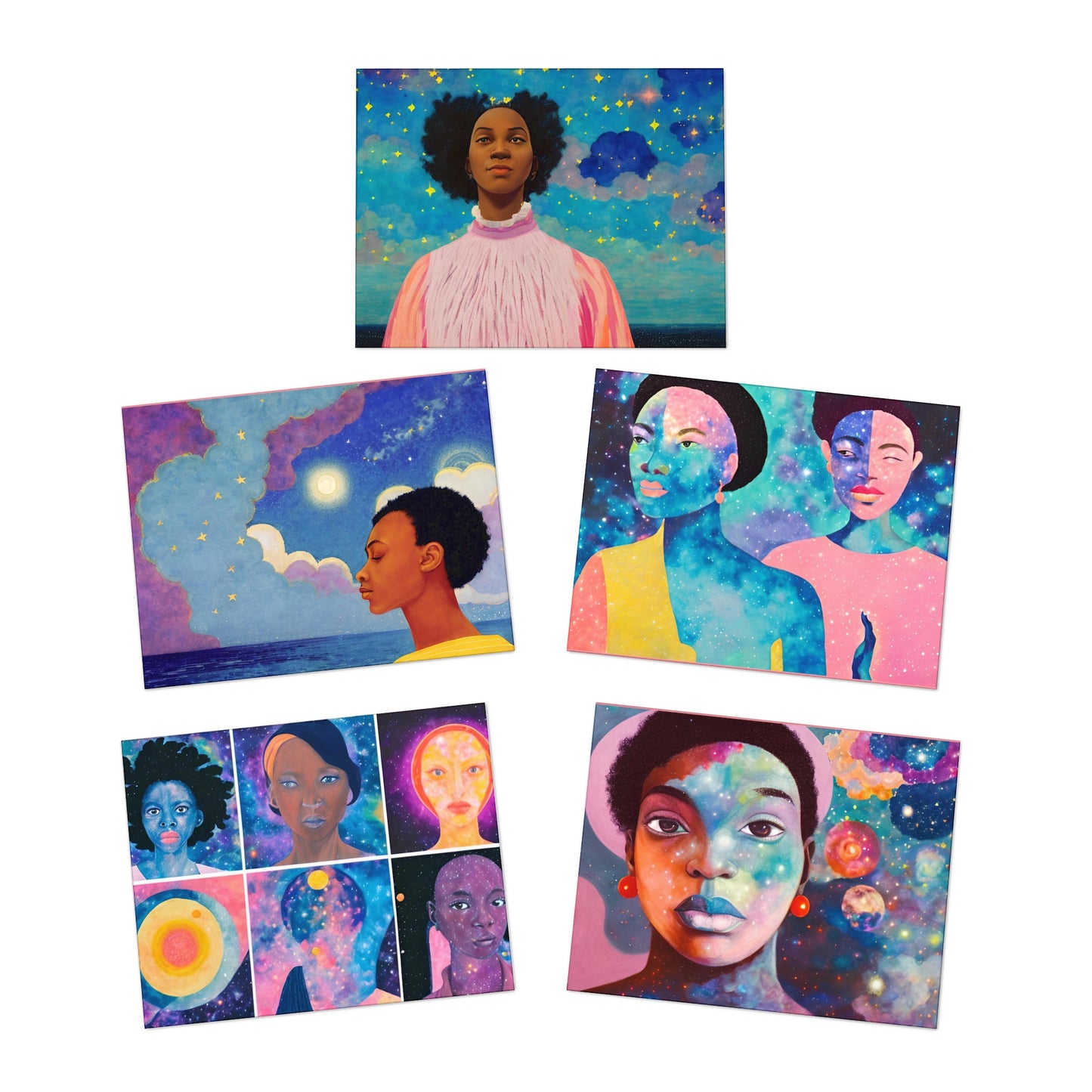 Contained within this collection is a spectrum of surreal artwork, each card presenting a unique celestial scene that marries the cosmos with the complex beauty of the human form. These mini-canvases of otherworldly charm are perfect not only for sharing thoughts with loved ones but also for adorning the walls of those who appreciate art that speaks, that feels, that resonates.