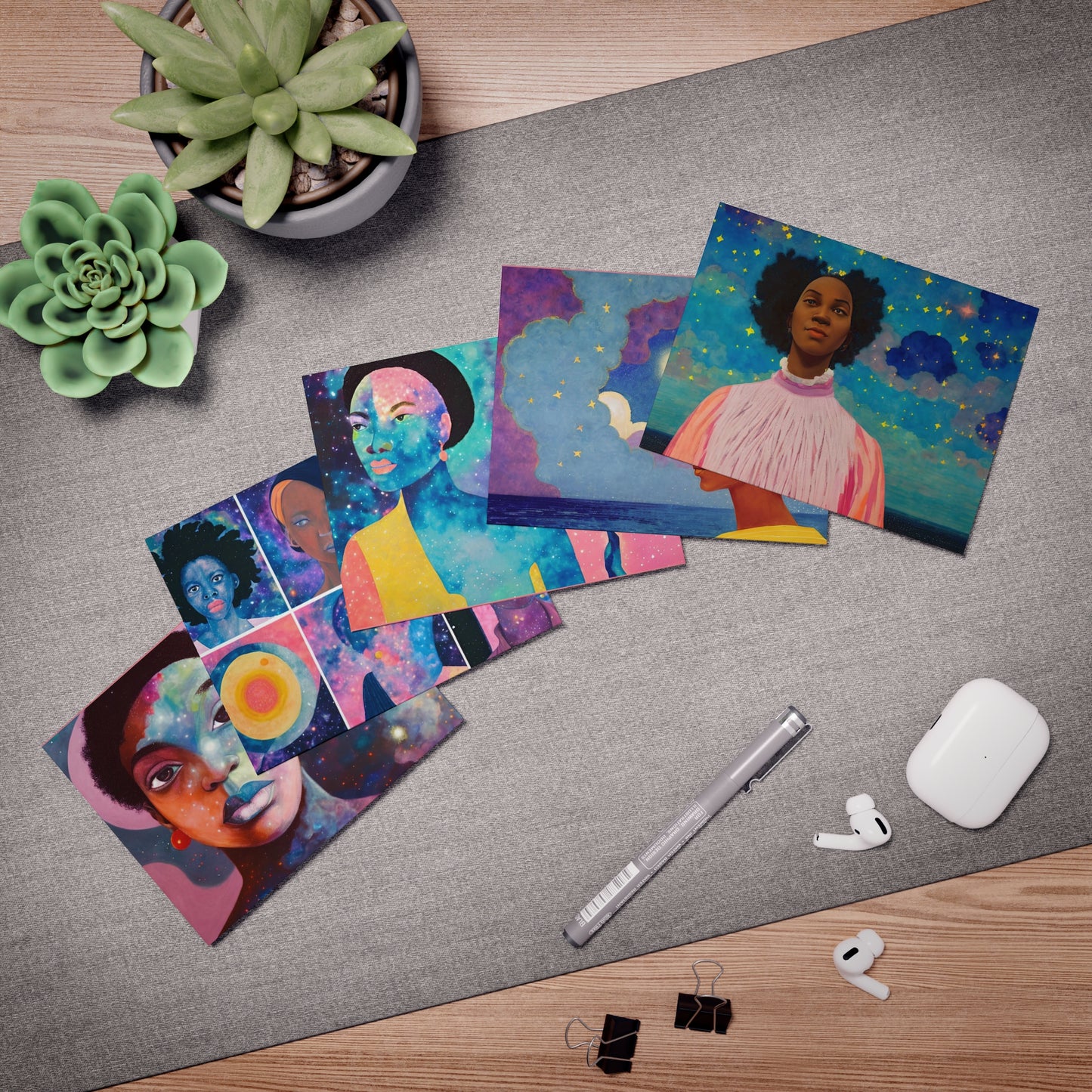 Embrace the ethereal allure of the "Stardust's Daughters" greeting card collection, where art and sentiment dance amidst the cosmos. This set of five captivating cards, each measuring a delicate 4.25" by 5.5", is a tribute to the mystique and beauty of the universe reflected in the soulful faces of its daughters.