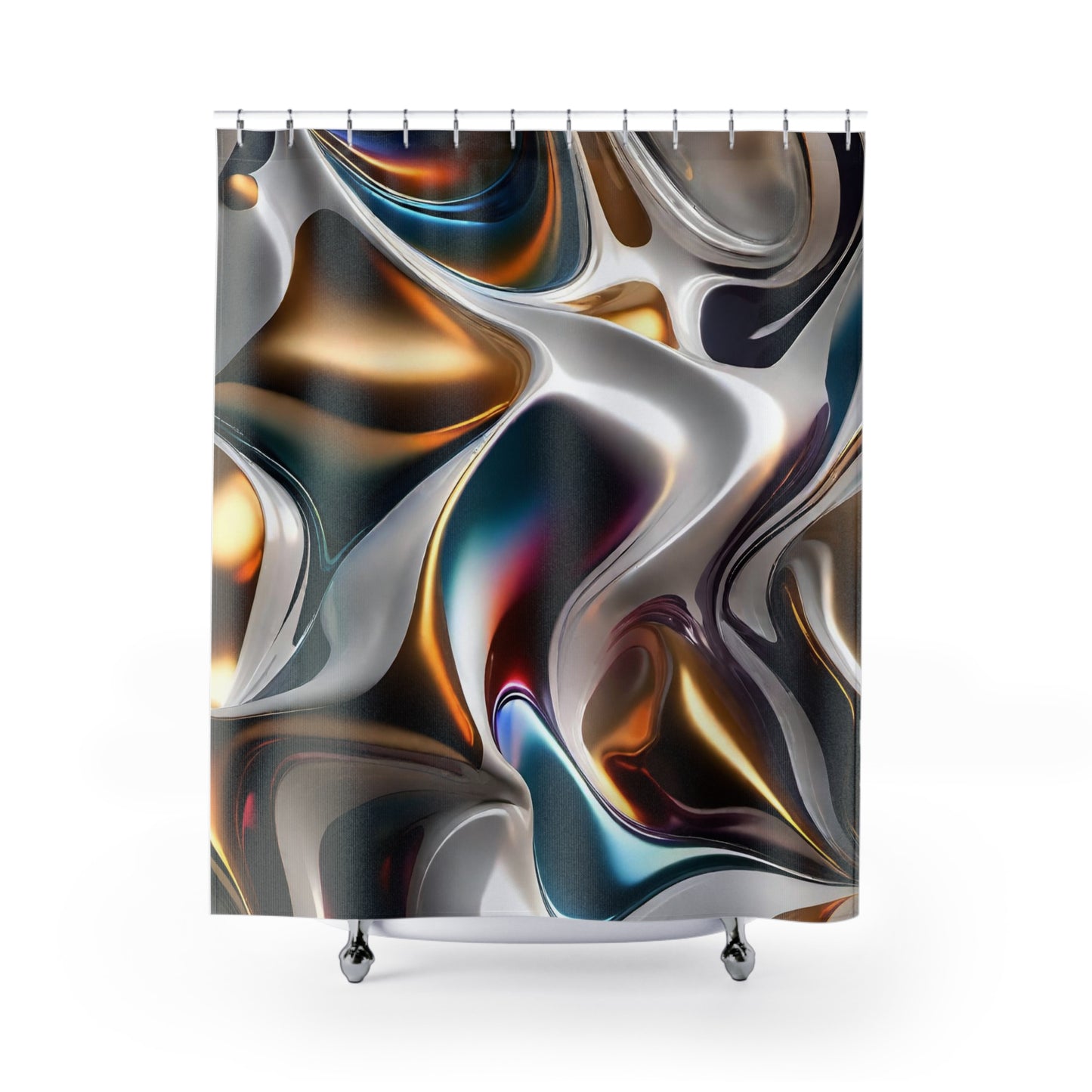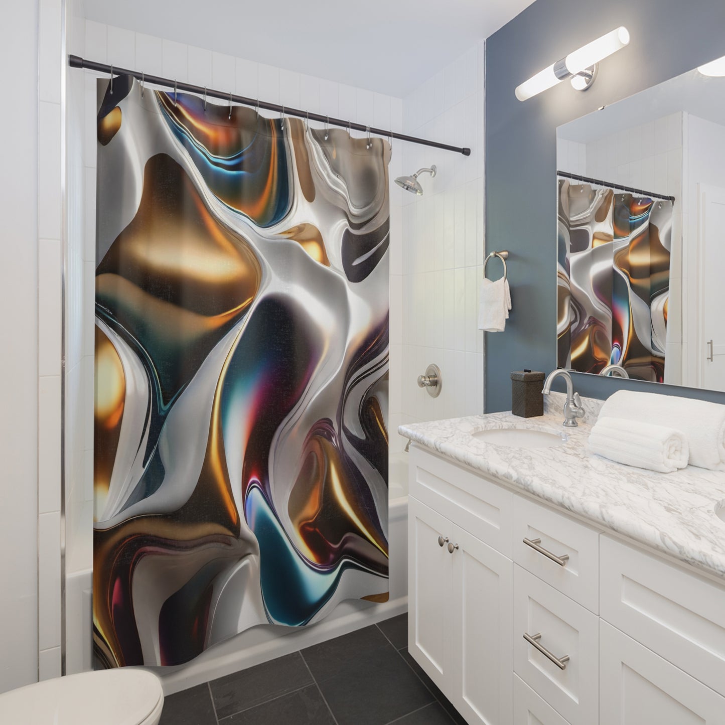 Introduce an element of modern elegance into your bathroom sanctuary with our Future Textures Shower Curtain. This shower curtain is a piece of art that transforms your space into a gallery of modern abstraction. The design features a mesmerizing blend of fluid metallic hues, creating a dynamic and sophisticated atmosphere that captivates and inspires.