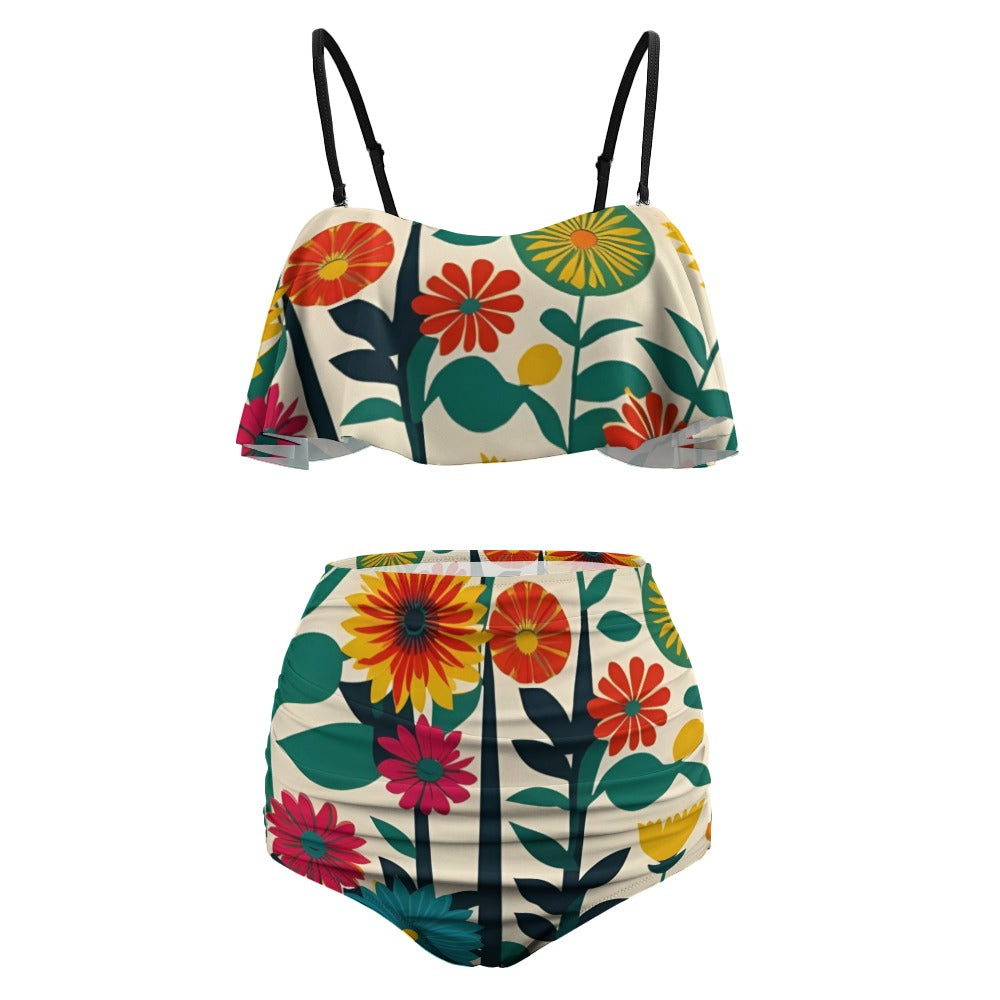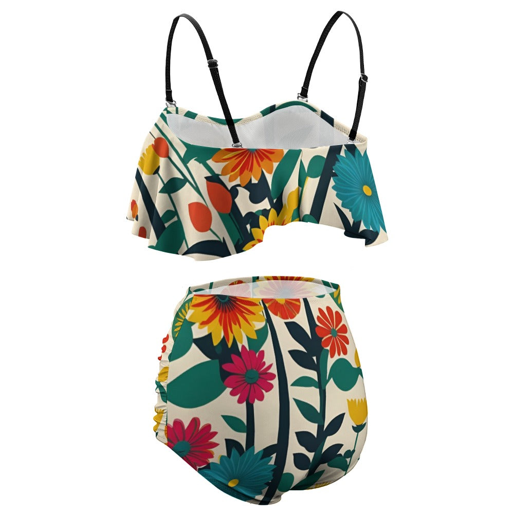 The Riviera Bikini is flirty and fun with a high waist ruched bottom and a flounced top with adjustable straps.
