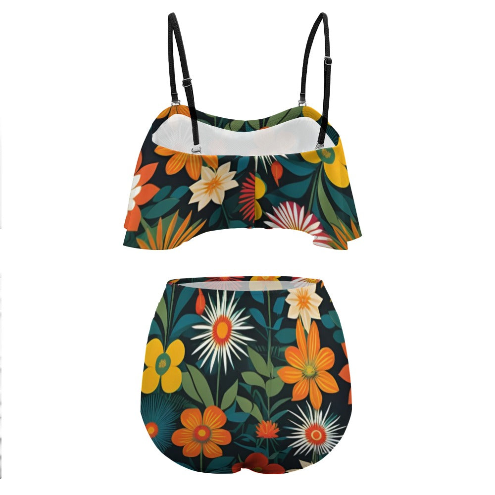The Riviera Bikini is flirty and fun with a high waist ruched bottom and a flounced top with adjustable straps.