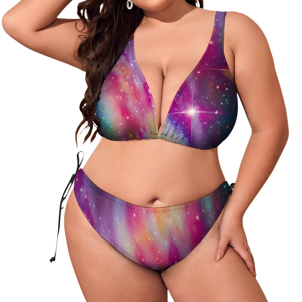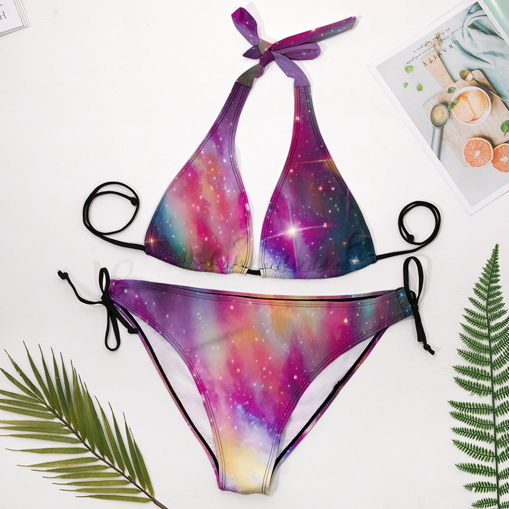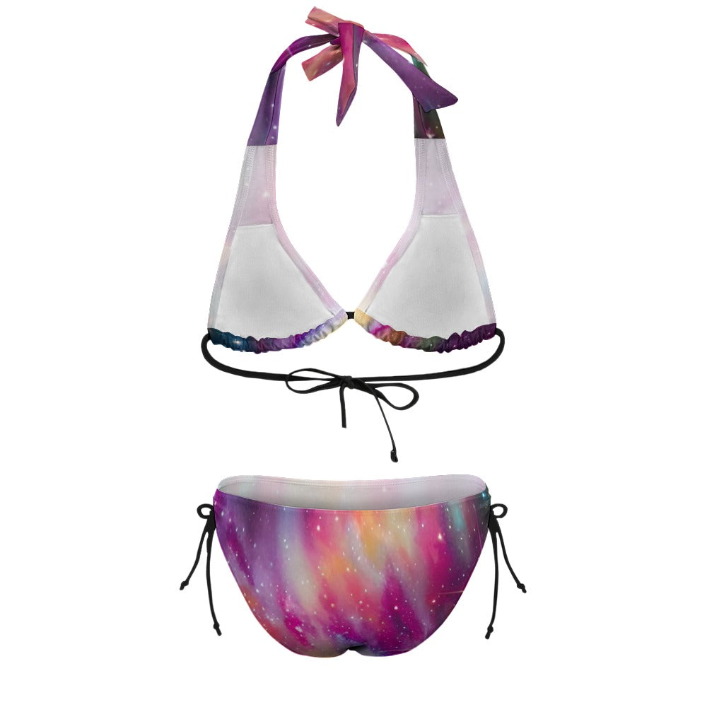 You will be an angel from heaven in this spacy string bikini with a supportive halter sling top
