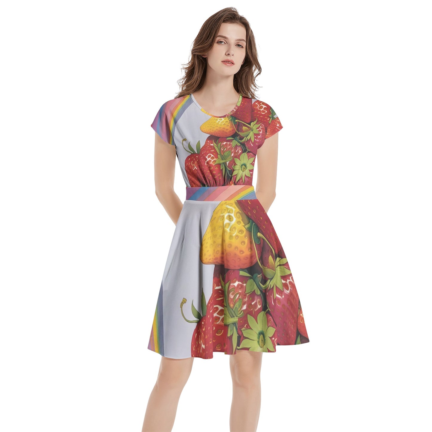 The dress features a classic crew neck and delightful short batwing sleeves that add a hint of ethereal glamour to your movements. The ruched waist cinches gently, creating a flattering silhouette before cascading into a flared hem that dances around your knees, promising to turn heads with every step you take.