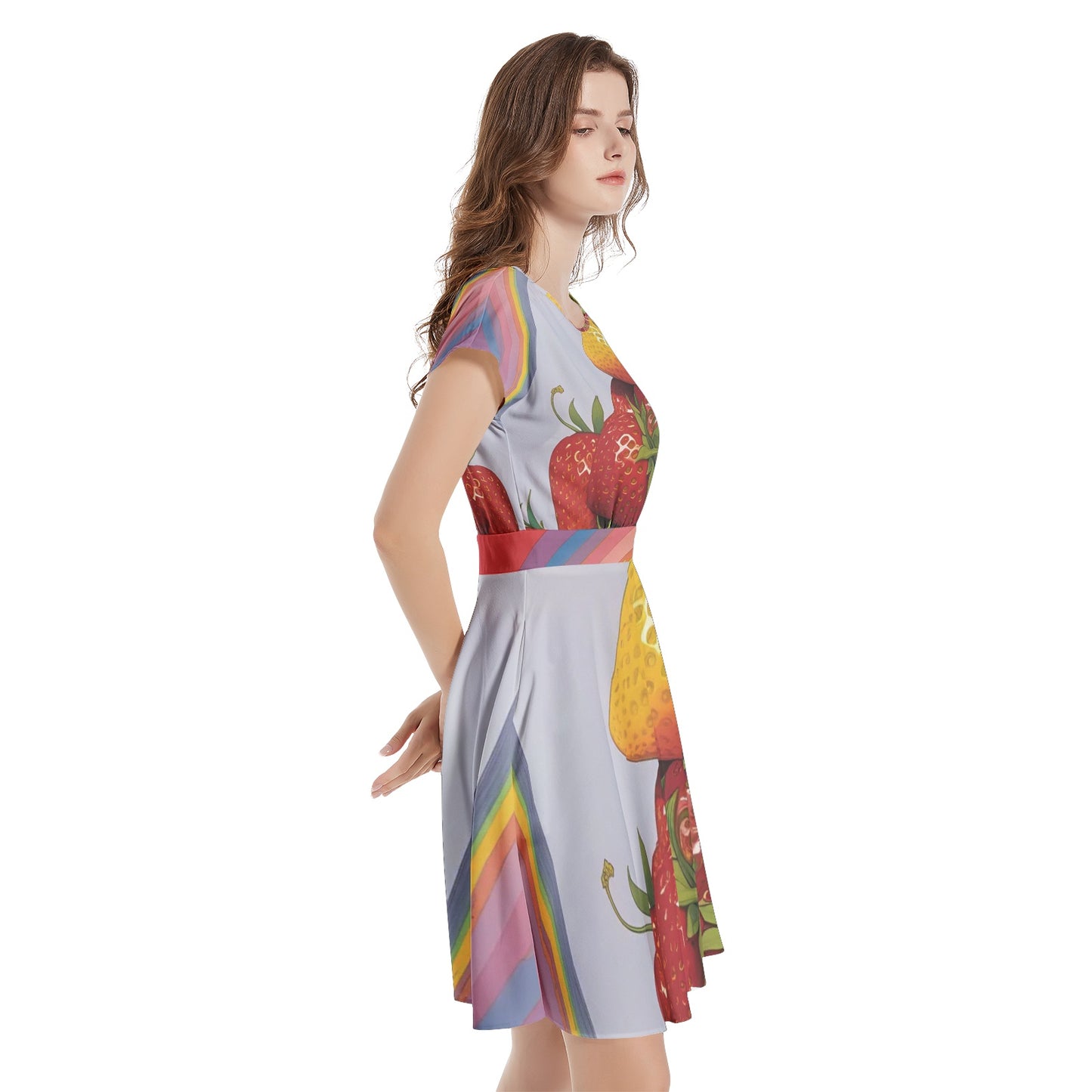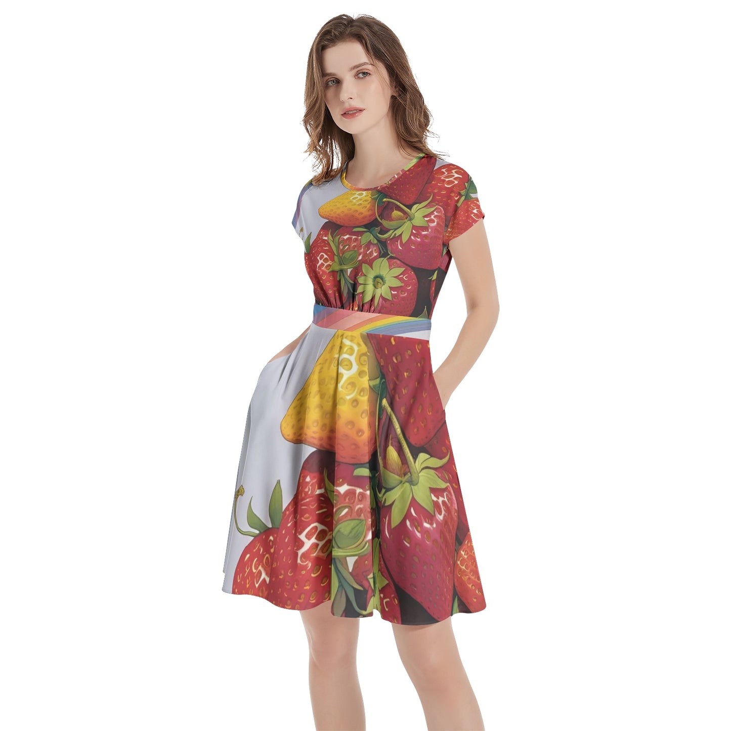Step into a world where artistry and elegance intertwine with our captivating Juicy Bytes Kimber dress. This masterpiece boasts a stunning mosaic of vibrant strawberries against a canvas of soft grays and pastel hues, a print that celebrates the whimsical charm of summer's bounty. Perfectly designed for the modern muse, it's crafted from airy, 100% polyester woven chiffon, offering a graceful drape that's as light as a summer breeze.