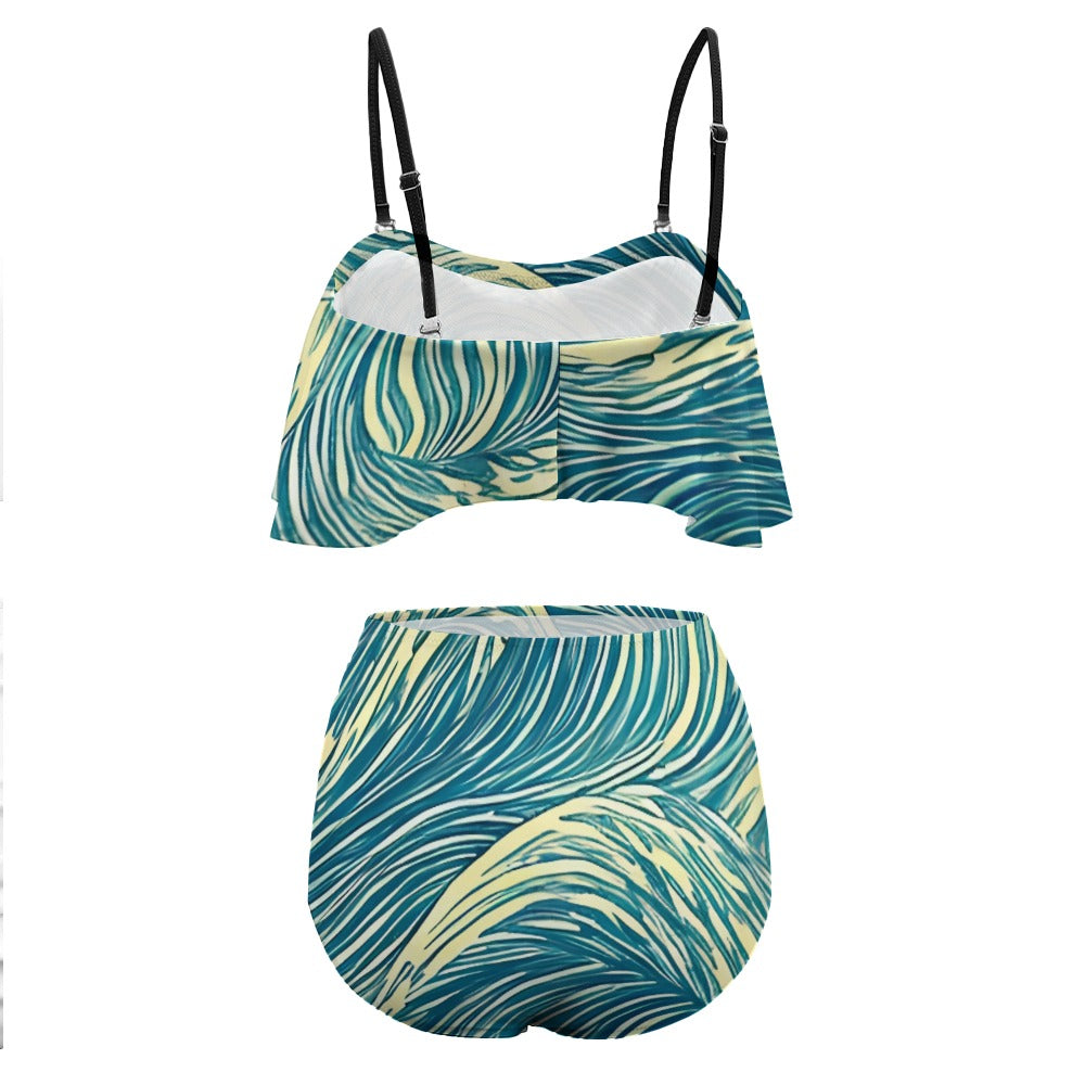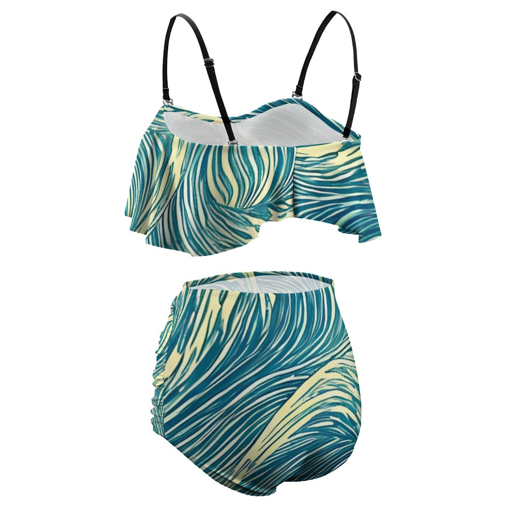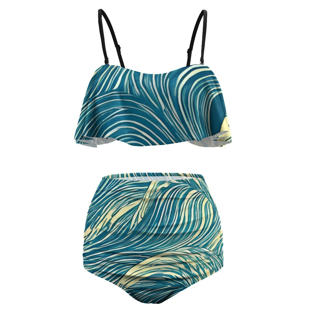 The Riviera Bikini is flirty and fun with a high waist ruched bottom and a flounced top with adjustable straps.